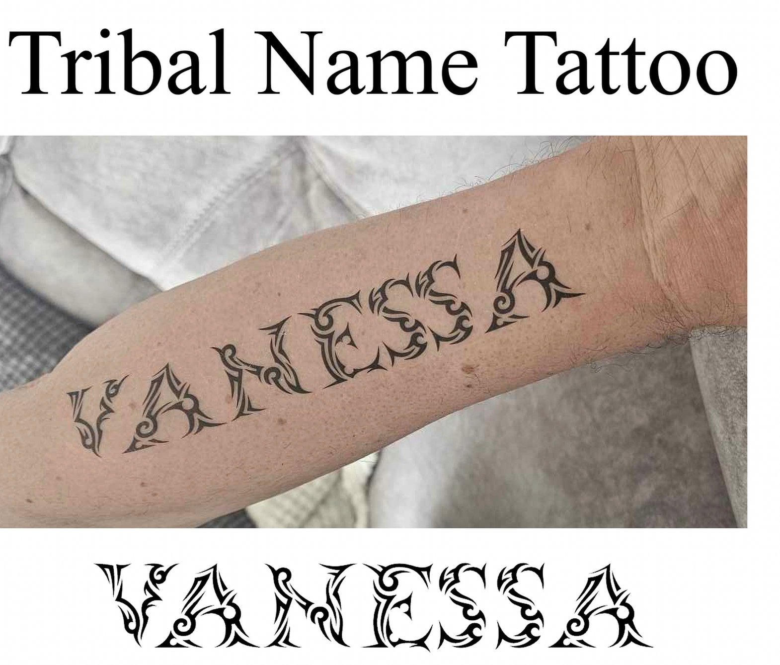 Tribal Style Name Temporary Tattoo.Length will Vary but Height is 27mmPLEASE NOTE SPECIAL CHARACTERS CAN NOT BE PRINTED.THIS ITEM IS 1 TATTOO