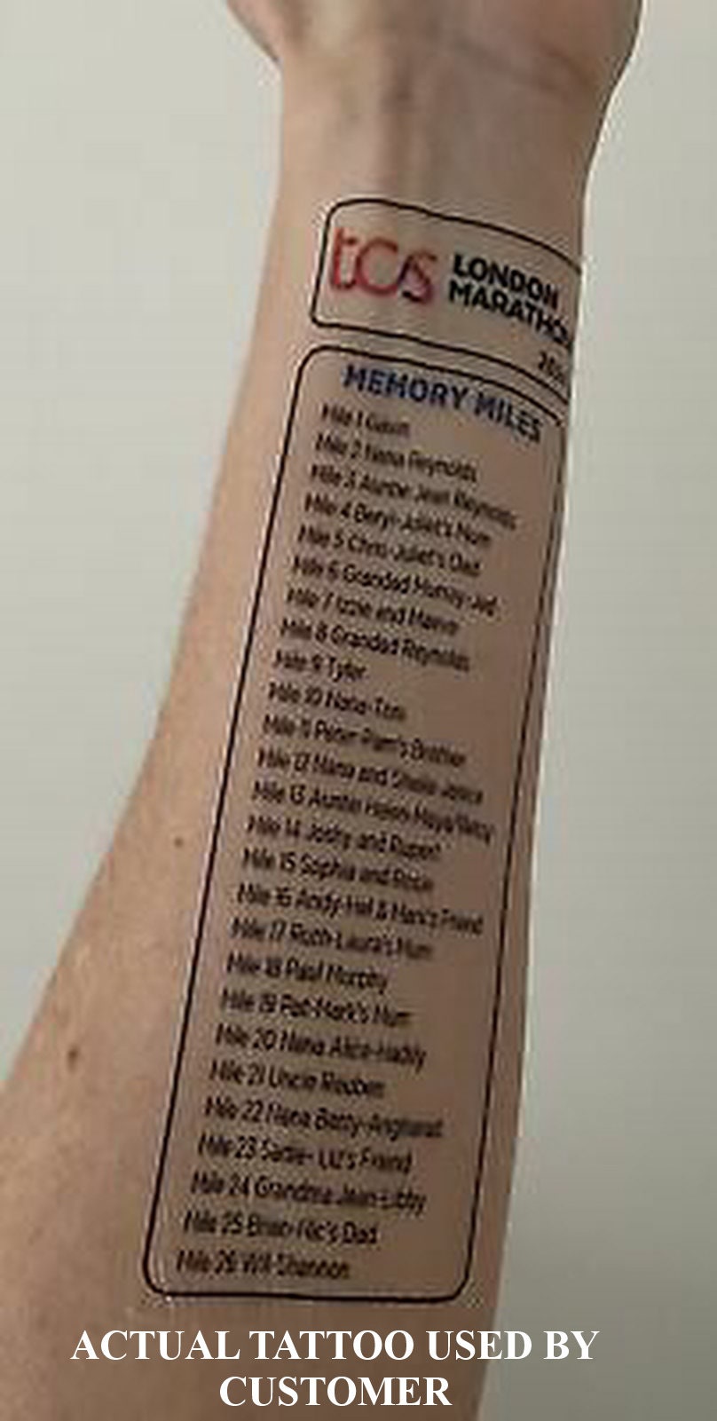 The tattoo can be used for any Marathon you want. Where possible a Logo for the relevant marathon will be designed and place above.