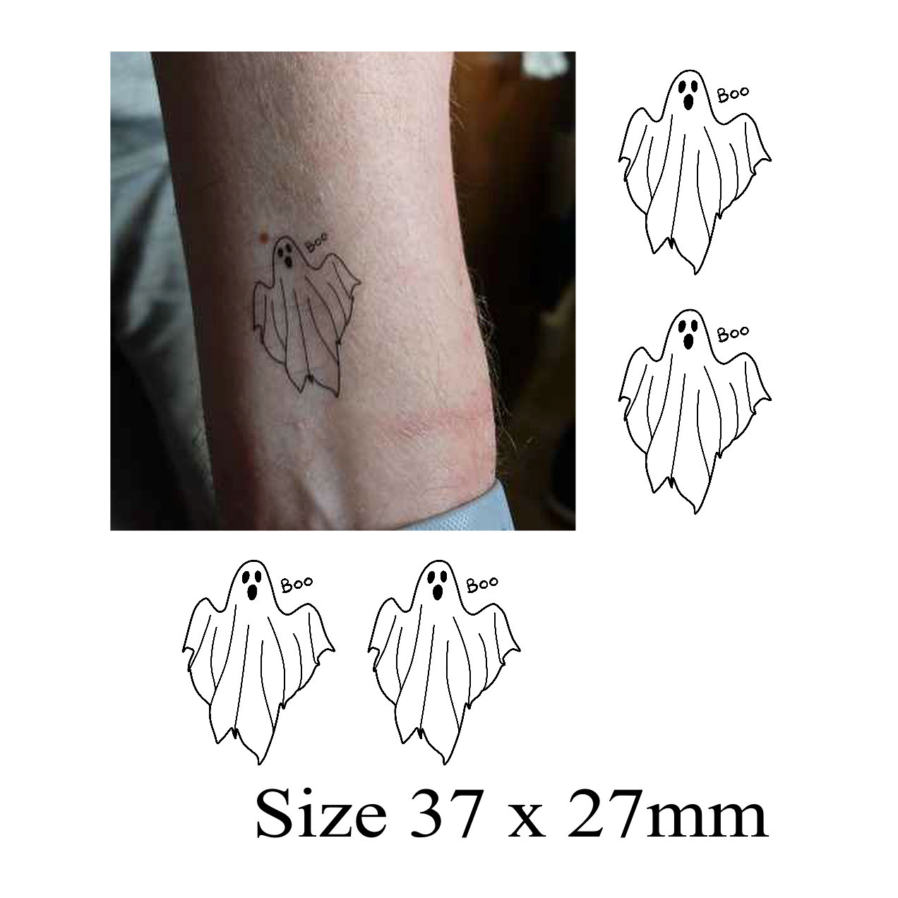 Boo ghost TattooApproximate Size 37 x 27 mmThis listing is for 4 tattoos at the size above.Full Photo Illustrated Instructions Enclosed with tattoos.
